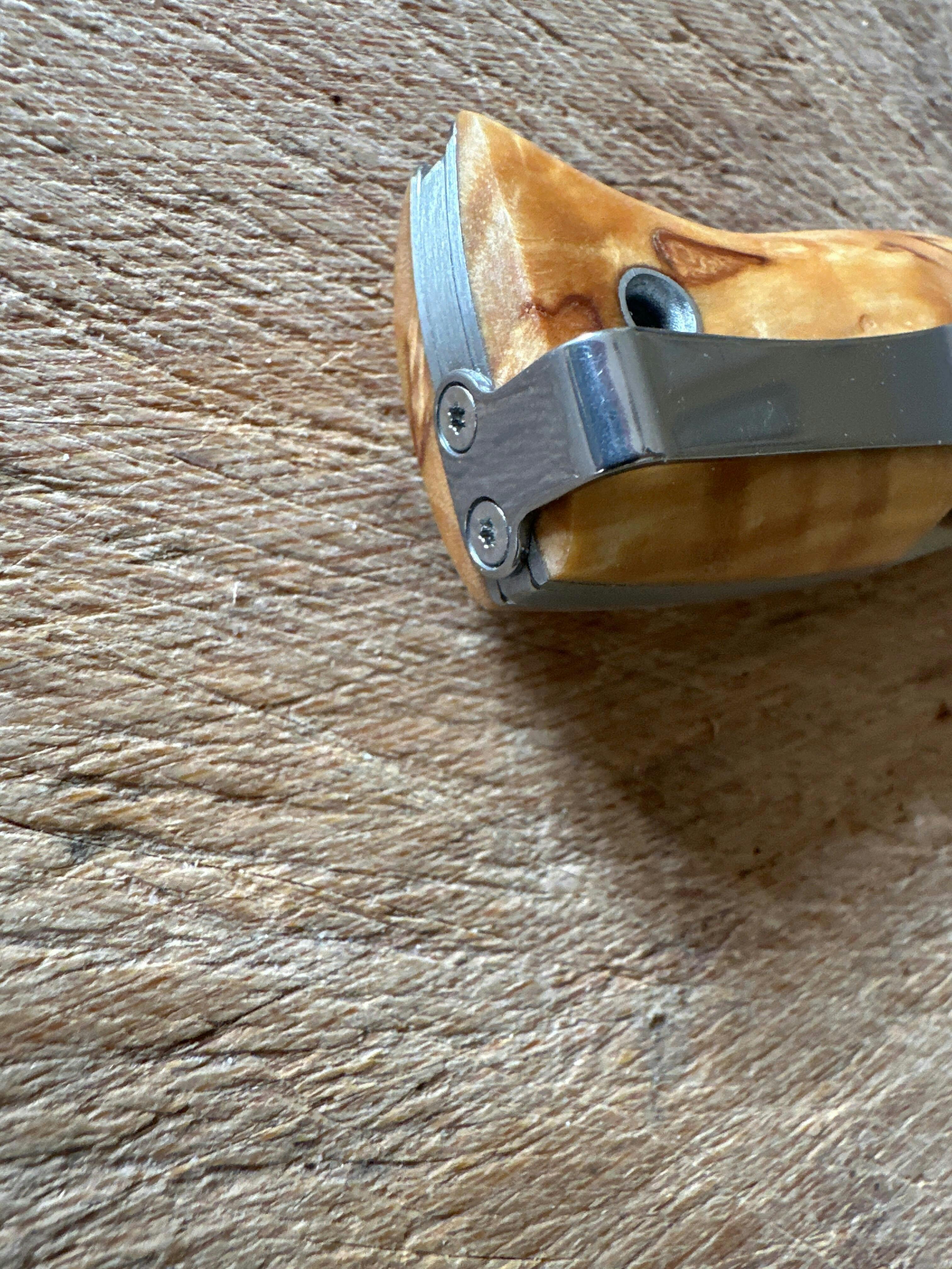 schönes Taschenmesser; speziell der Maserbirkengriff und die Gesamtform des Messers, offen und geschlossen.