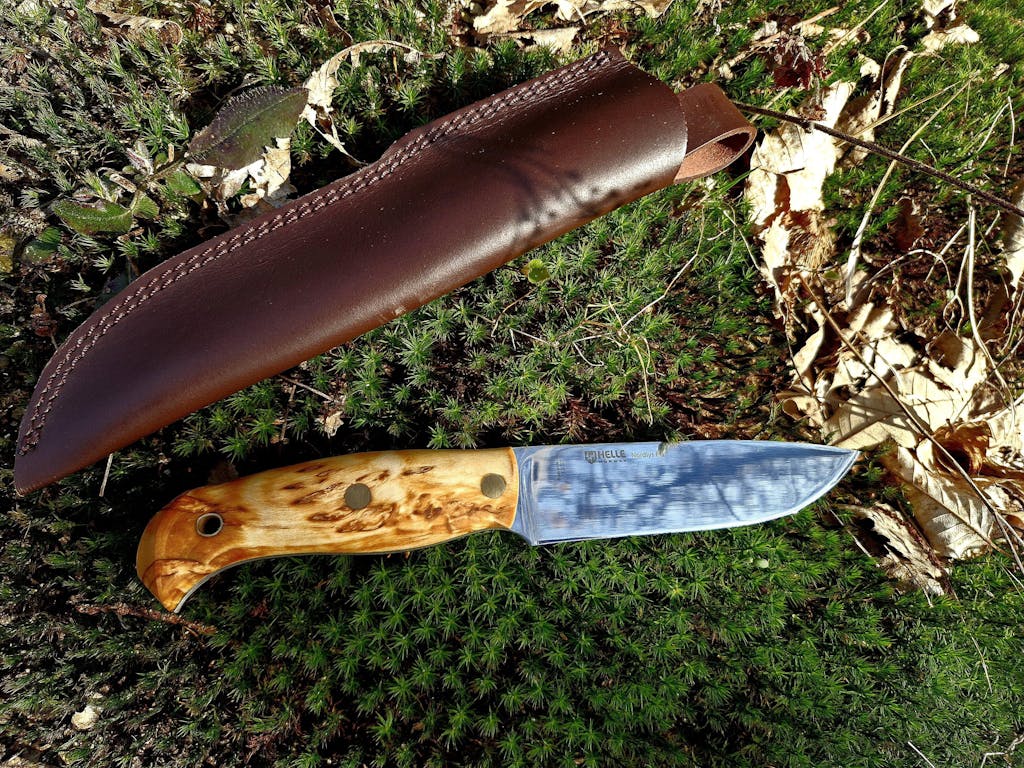Helle Nordlys FG is one of the best bushcraft/outdoor knives. It is made of a solid and exellent quality stainless steel full tang blade, a wonderful curly birch handle that gives a comfortable grip. It is also a good looking knife with his leather sheath. Helle Nordlys can be used with a ferro rod to light a camp fire thanks to his 90° spine. Very recommended knife